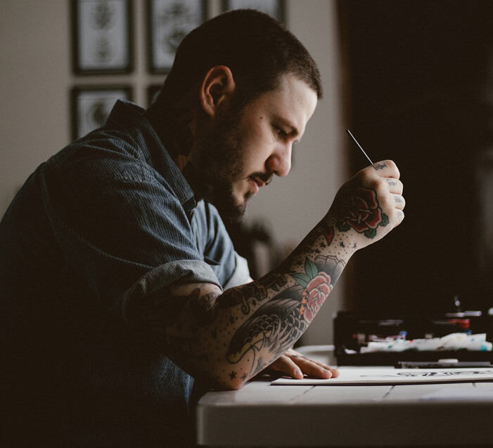 Original creations by tattoo shop artists, blending styles such as realism, abstract, watercolor, and surrealism.